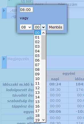 Ha a felhasználónak van hozzá jogosultsága, akkor a név választó listboxban kiválaszthat más alkalmazottat is ls szerkesztheti az ő munkaidő adataikat is.