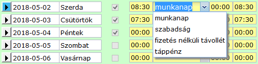• 4 értéke van: munkanap, szabadság, táppénz, fizetés nélküli távollét. Csak ezek választhatók egész napra. A csúsztatás rész-napra is választható.