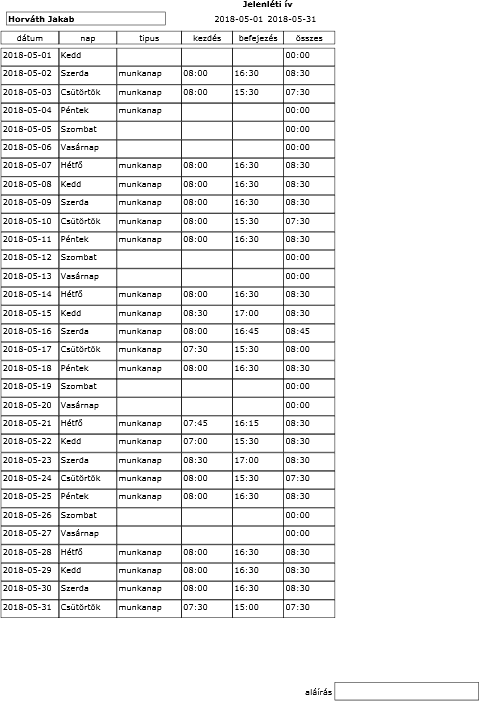 Lehetőség van a havi jelenléti ívet kinyomtatni PDF formátumban. A Nyomtatás gombra kattintva egy új fülön fog megjelenni