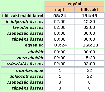 • Időszaki összegek: a kiválasztott személyre vonatkozó, de a teljes kijelölt időszakra számított összegek. A listában ugyan csak a tárgynapi rekordok szerepelnek, de ettől függetlenül ezeket az összegeket a a kiválasztott személy összes tárgyidőszaki rekordjára kell képezni.