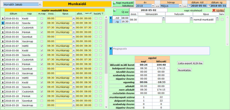 • Időnyilvántartás lista, a nevek sorában a nevektől jobbra helyezkedik el. A számolt mezők kivételével írható mezők, a dolgozók maguk szerkeszthetik.