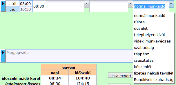 • A szabadság és táppénz itt nem választható, csak a megjelenítés miatt van a listában.