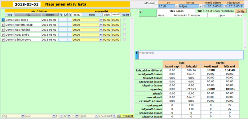 A napi jelenléti ív listában a kezdő dátumnál megadott napi jelenléti ívet láthatjuk.