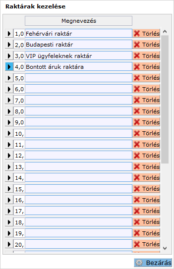 A listában látjuk a 32 lehetséges raktárhelységet. Egyszerre 20 elem fér ki a képernyőre, a panelen belüli görgetősávval tudjuk görgetni azt.