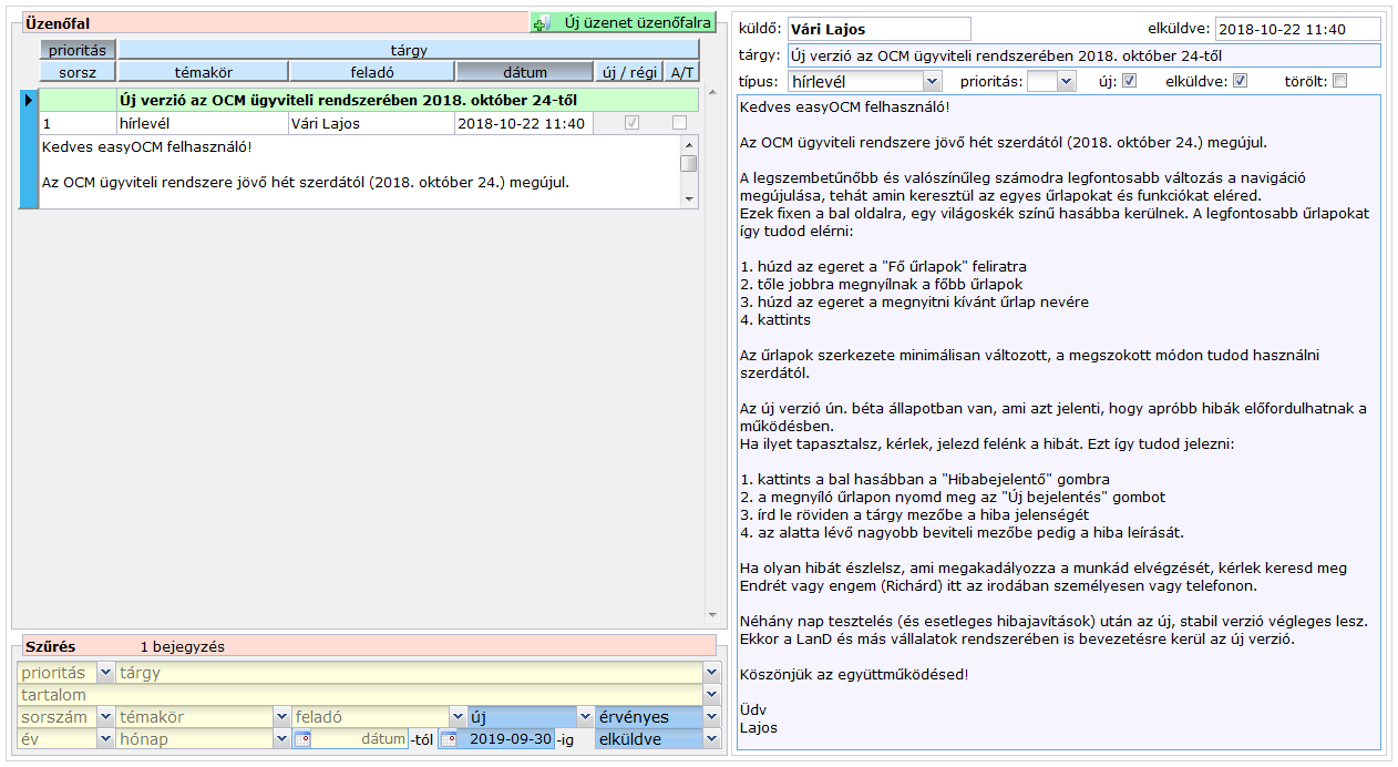 Adminisztrátor jogosultságú felhasználó a meglevő üzenetek is tudja módosítani. Kattintsunk a bal panelen egy üzenetre. A jobb oldali panelen megjelenik az üzenet összes adata. Minden adata átírható illetve módosítható.