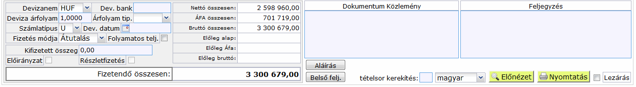 Legalul a fizetendő összeg látható, ami a bruttó teljes összeg és a bruttó előleg összeg különbsége. Valamennyi összeg számított mező, így egyik sem írható, és bármely tételsor vagy az árfolyam megváltoztatásakor a rendszer automatikusan újraszámolja a megváltozott értékeknek megfelelően.