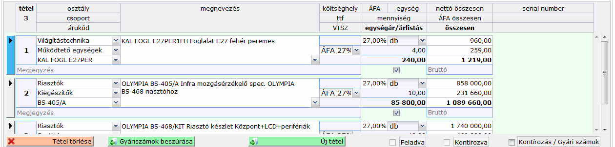 1. A Bizonylat részletei űrlapon manuálisan soronként megszerkesztve