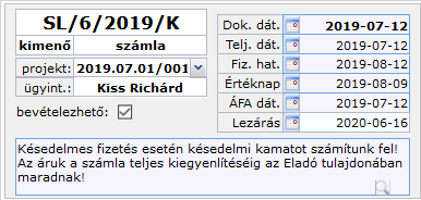 • Bizonylat sorszáma: Az adott típuson és irányon belül a következő sorszám, ami a bizonylatot egyértelműen azonosítja, ami nem szerkeszthető adat. A sorszám formátuma: XX/sorszám/év/irány, ahol az XX a dokumentum típusa (pl. SL = számla), az irány B = bejövő, K = kimenő.