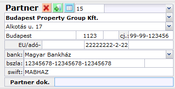 Az üzleti partner (pl. vevő, megrendelő) részletes adatait tölthetjük ki ezen a panelen. Új bizonylat létrehozásakor (kivéve a bizonylat másolás funkciót) ezek az adatok üresek és nem tölti ki a rendszer automatikusan.