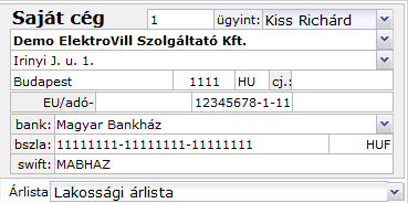 Saját cégünk adatai a bizonylat létrehozásakor automatikusan feltöltődnek a partner adatbázisból a saját alapértelmezett adatainkkal. Ha több telephelyünk és több bankszámlánk van, akkor a megfelelő legördülő listákban kiválaszthatunk más címet és banki adatot is.