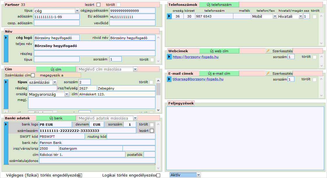 Az alapadatok azonosítják egyértelműen a partnert, ezért ezekből egy lehet érvényben. A többi adatból - pl. cím, telefonszám, bank - egyszerre több érvényes adata is lehet egy partnernek.