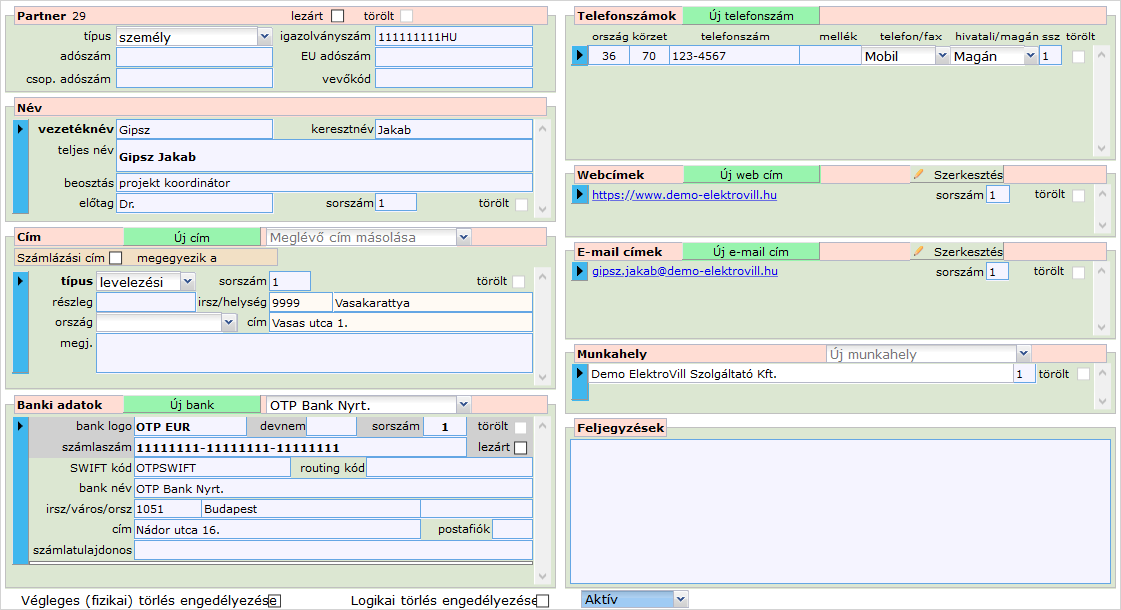 A partner részleti űrlap többi szekciójában a "Törölt" jelölőnégyzet az adatsorra vonatkozik. Ha rákattintunk, az adott szekcióban csak a kijelölt egyetlen adatsor fog törlődni, de nem véglegesen.
